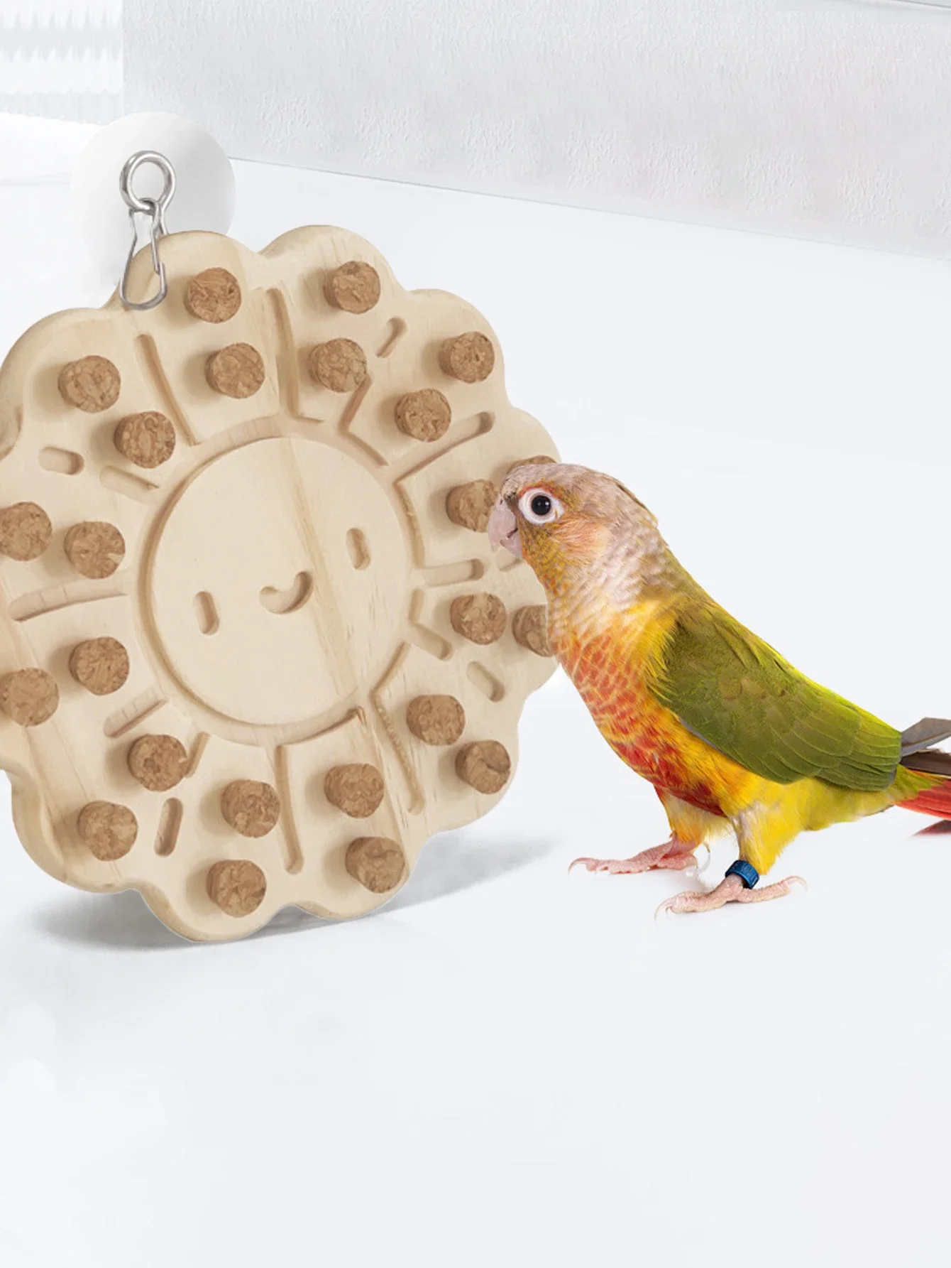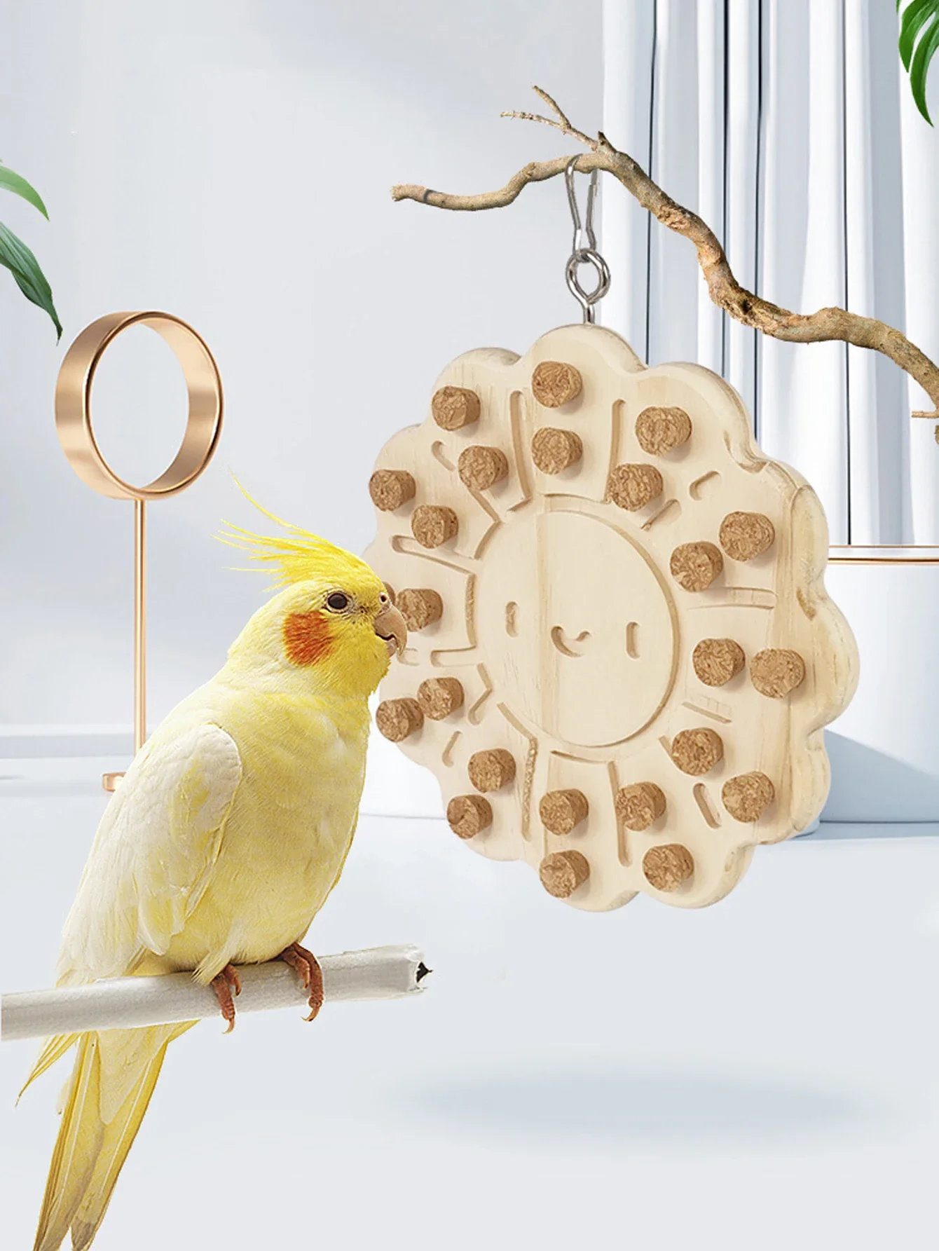 Juguete de madera para masticar loros en forma de sol, suministros educativos para mascotas pequeñas.